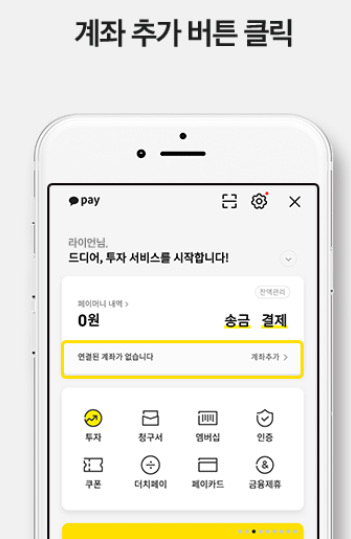 - 카카오페이 화면에서 '계좌 연결' 옵션을 찾아 클릭합니다. 본인 명의의 은행 계좌를 연결해야 합니다.