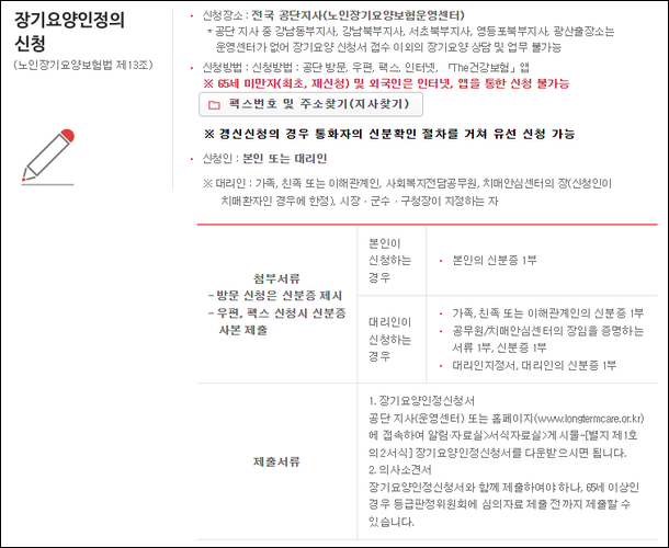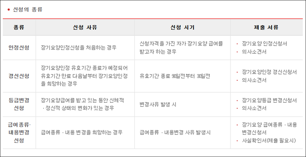- 의사소견서: 신청 시 제출하거나, 만 65세 이상인 경우 등급판정위원회 심의 전에까지 제출 가능
