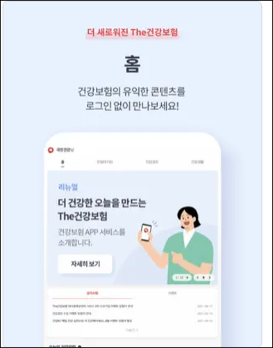 The건강보험 서비스는 공단 홈페이지내의 주요 콘텐츠를 국민들이 모바일에서 쉽고 빠르게 많은 정보를 접할 수 있도록 구성하였습니다.
