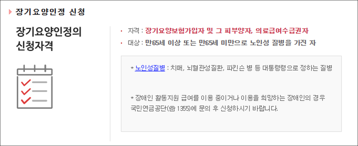 - 만 65세 미만으로 치매, 뇌혈관질환 등 대통령령으로 정한 노인성 질환을 가진 자