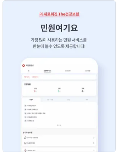더 건강한 국민의 삶을 위해 모바일로 편리하게 민원서비스를 이용하세요. 1. 민원여기요 - 자격득실확인서, 보험료 납부확인서 등 증명서 5종을 제출기관에 팩스로 보낼 수 있습니다. - 보험