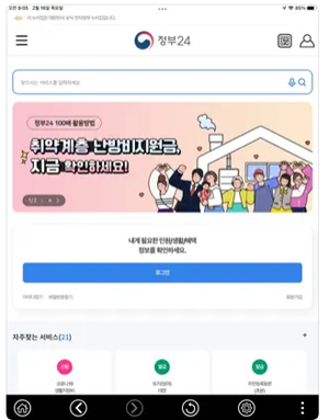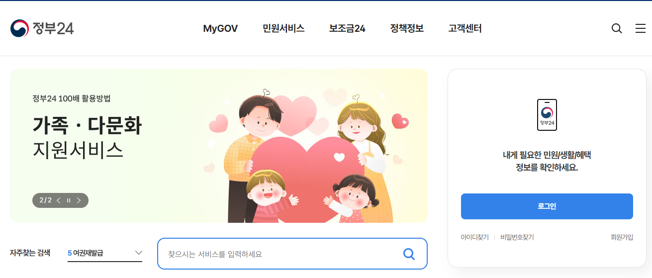 정부24는 정부의 서비스, 민원, 보조금24, 정책·정보를 통합 제공하는 대한민국 정부 대표포털 입니다.
